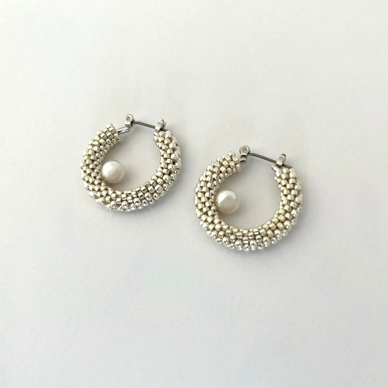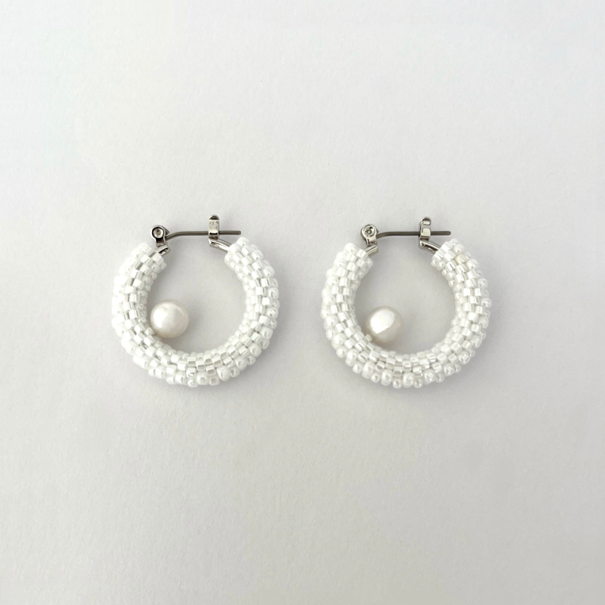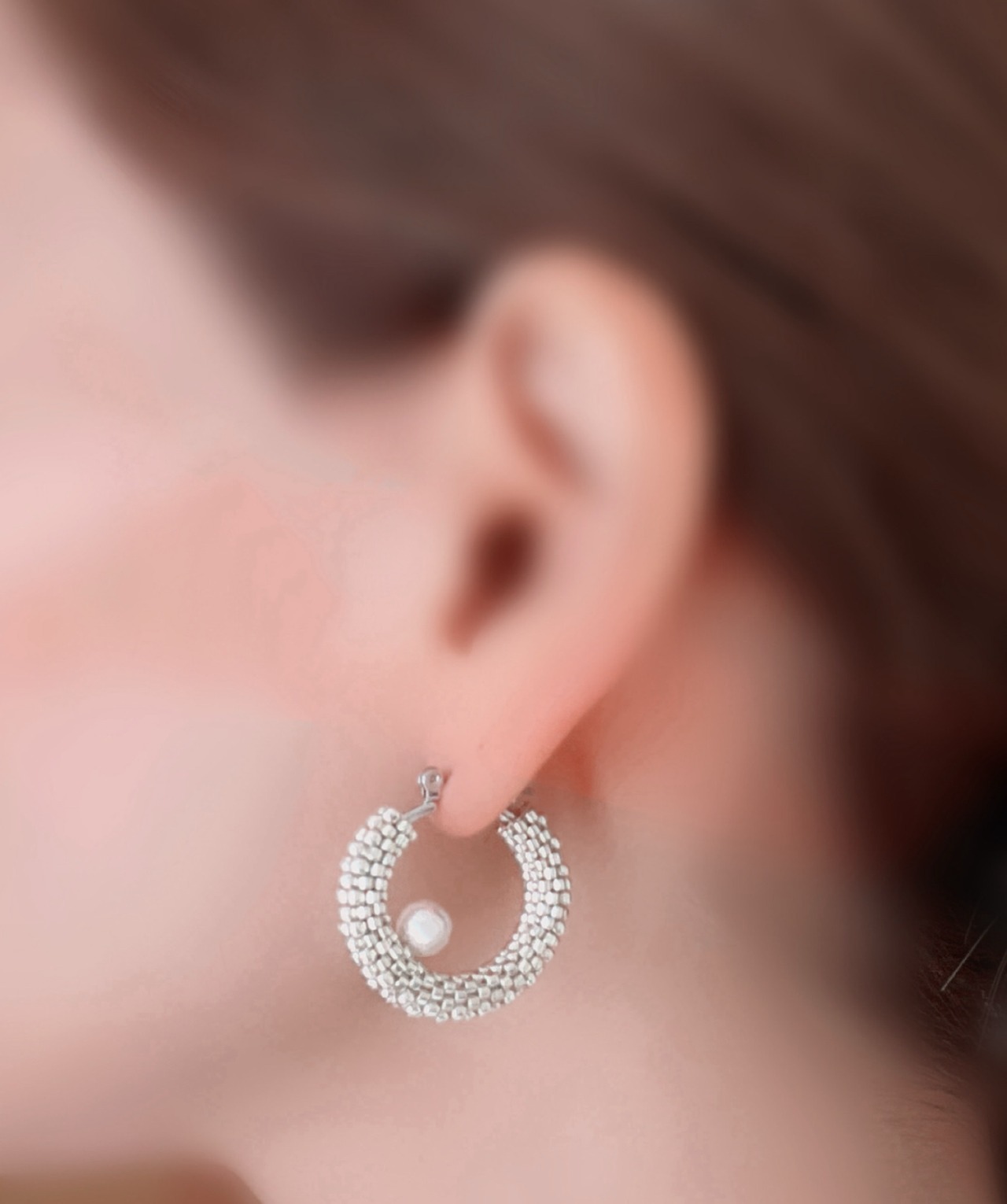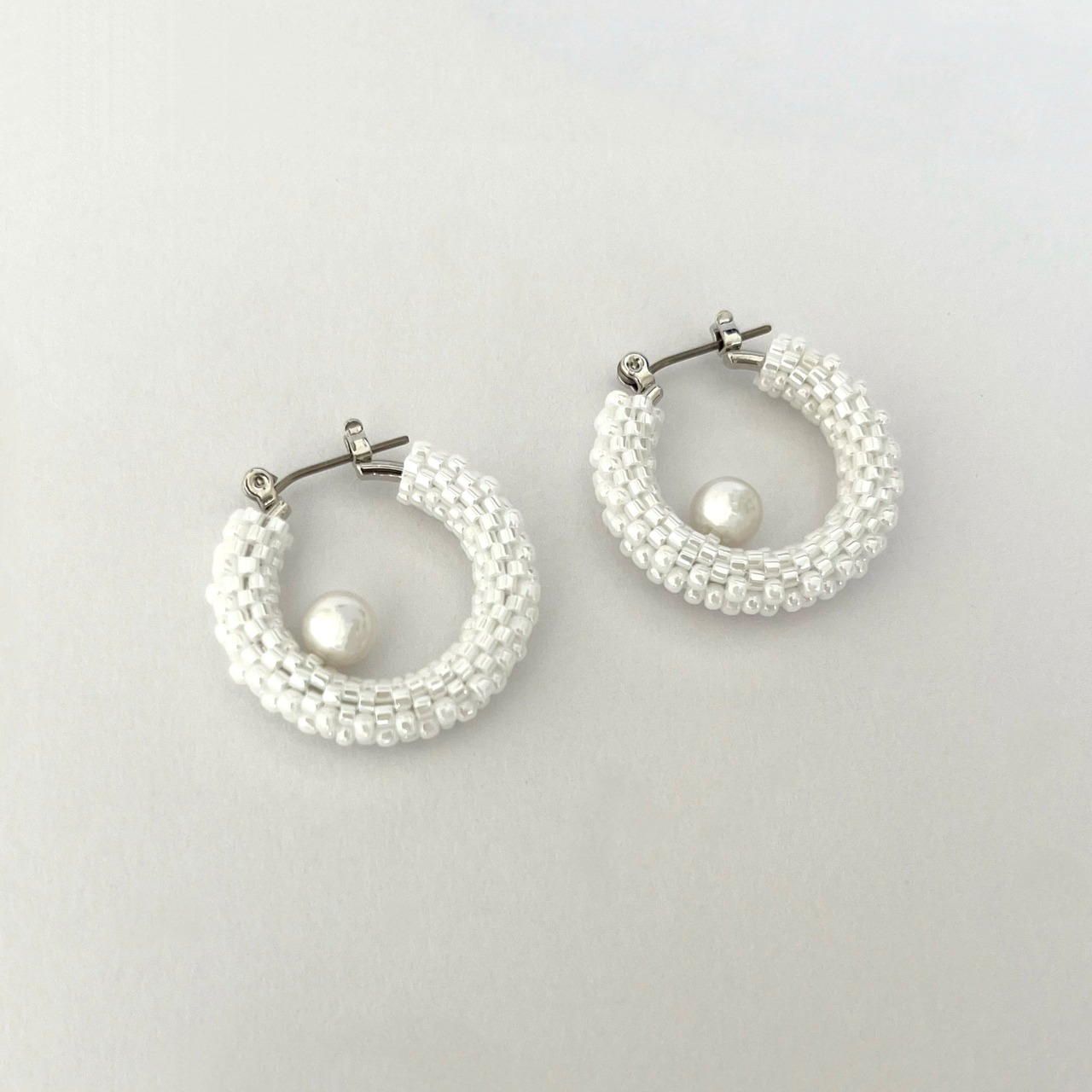 ビーズを一粒ずつ丁寧に編み込み、耳元をさりげなく彩るフープピアスに仕立てました。