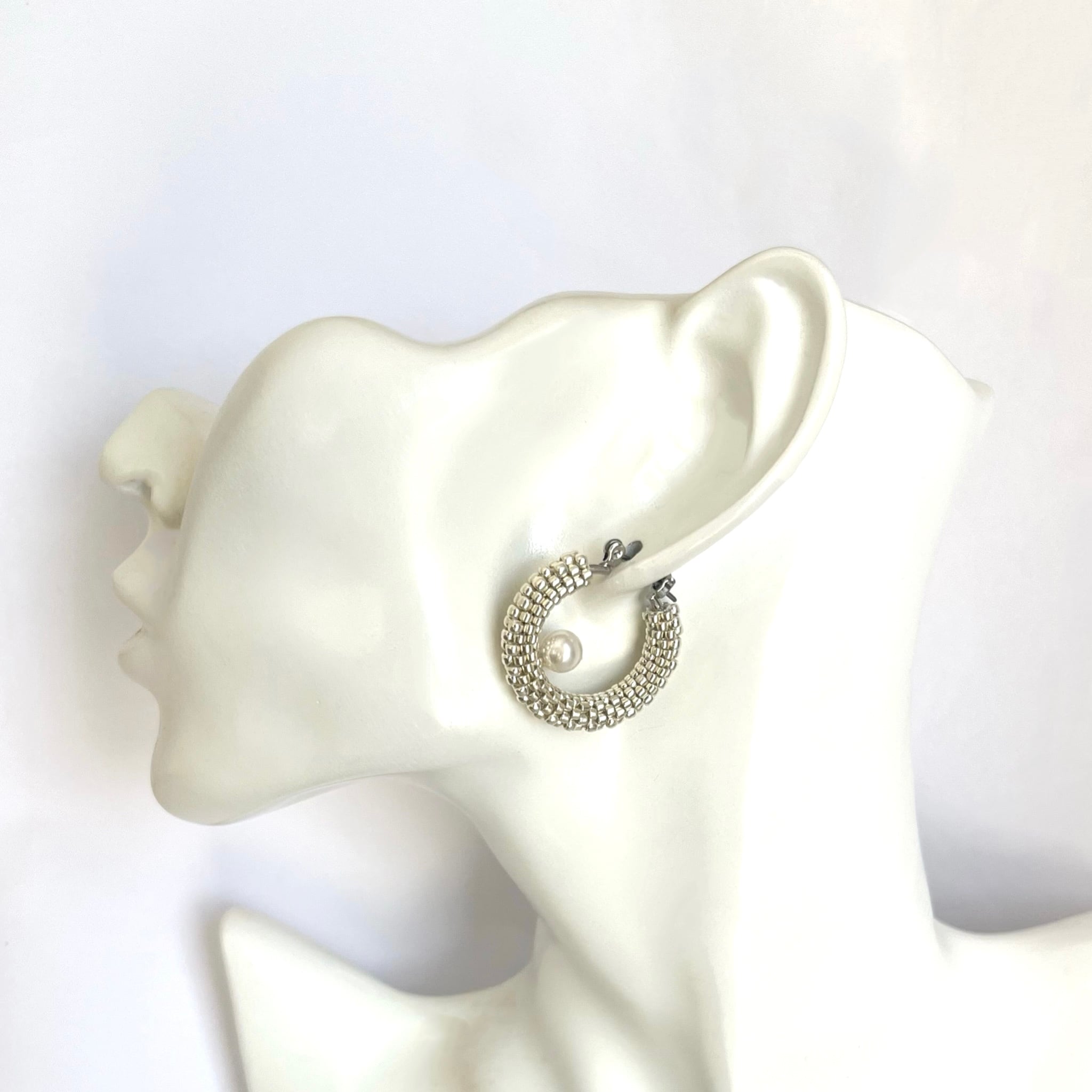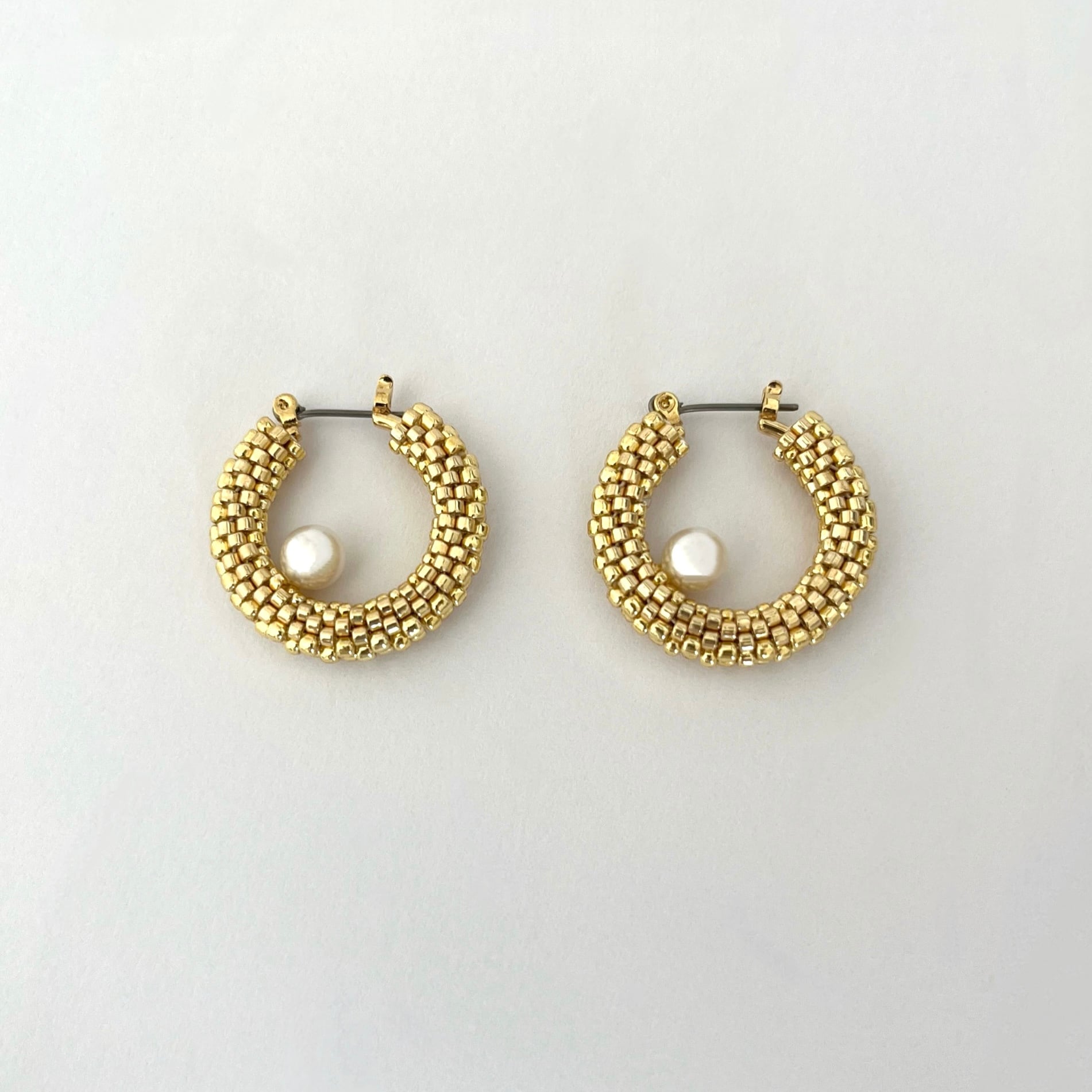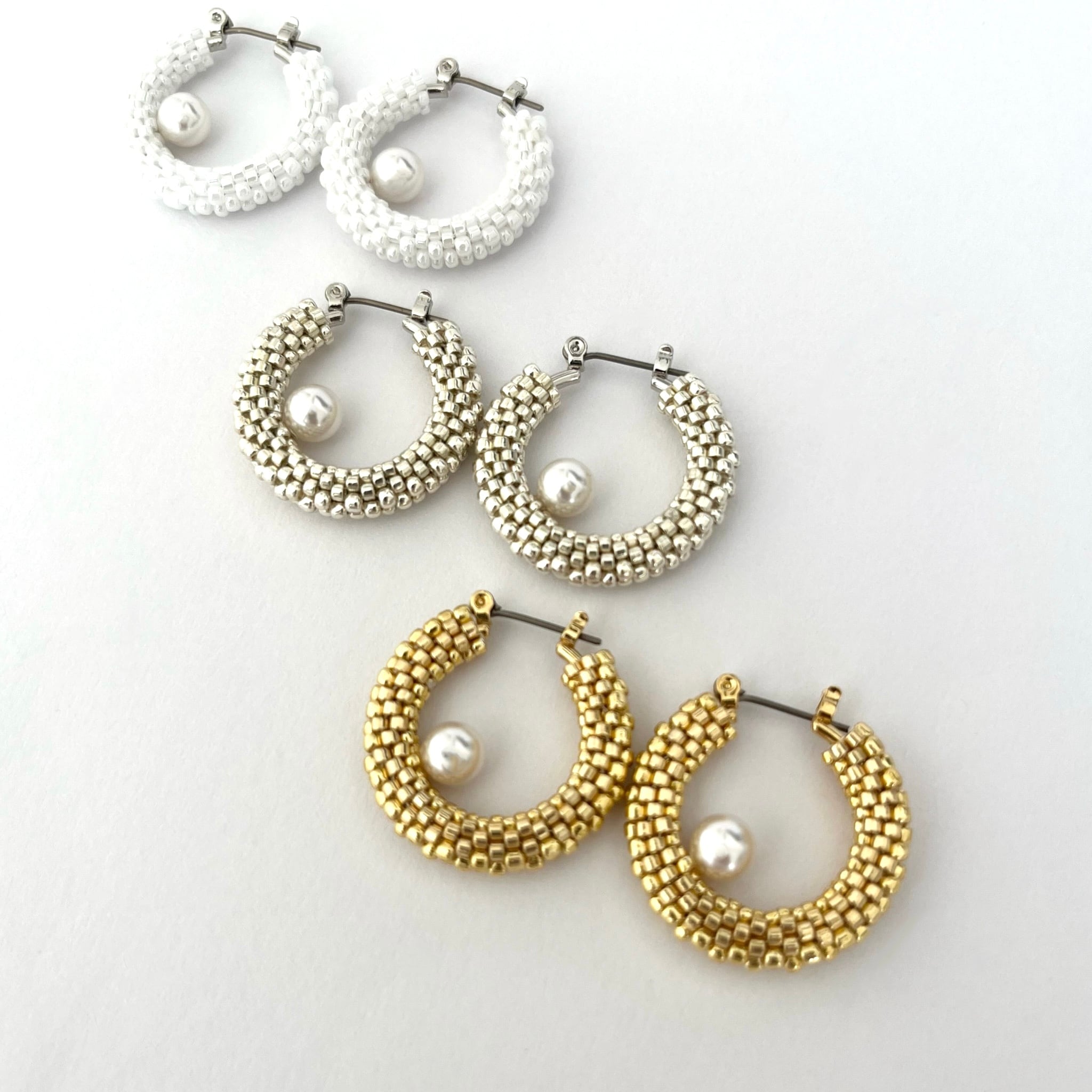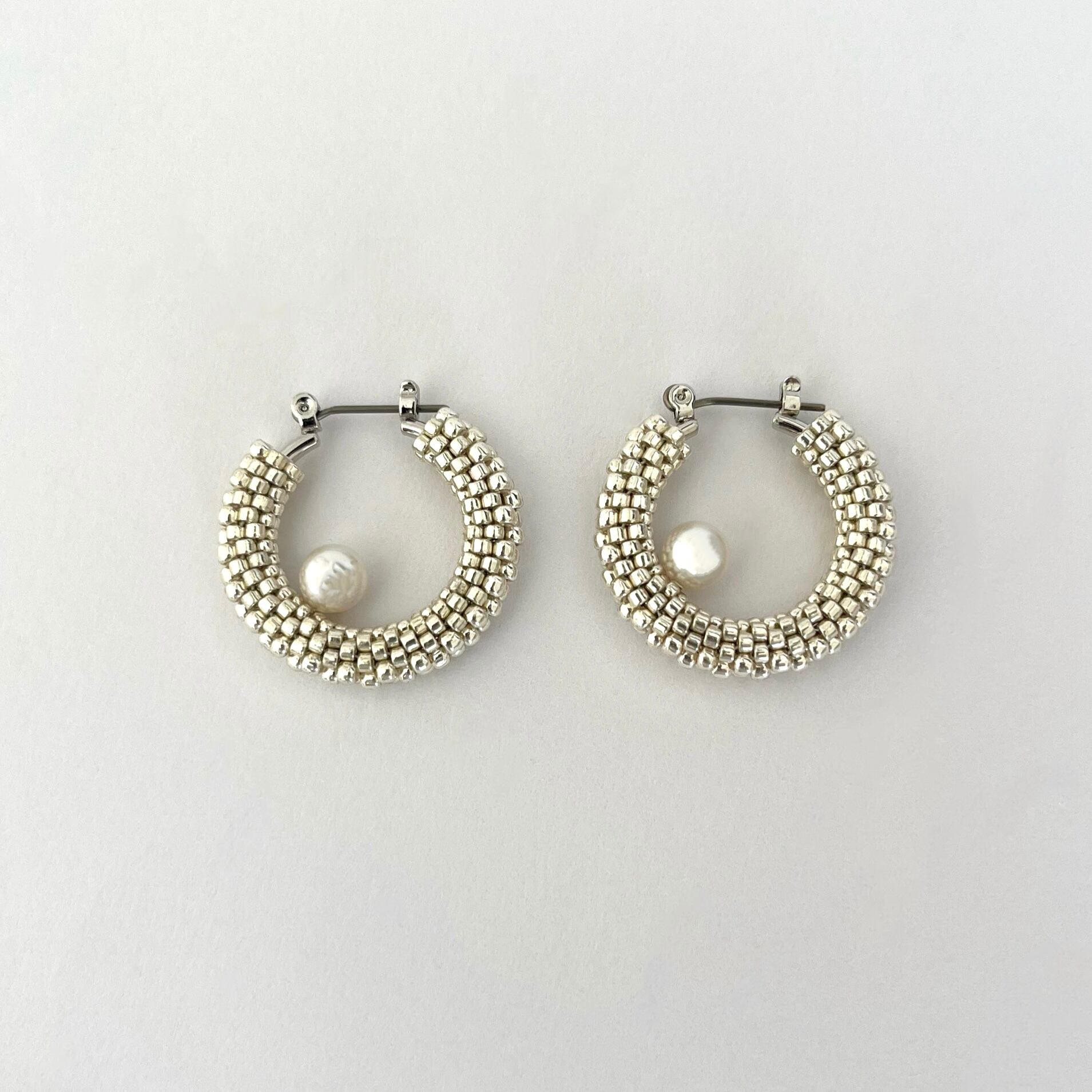 ビーズを一粒ずつ丁寧に編み込み、耳元をさりげなく彩るフープピアスに仕立てました。