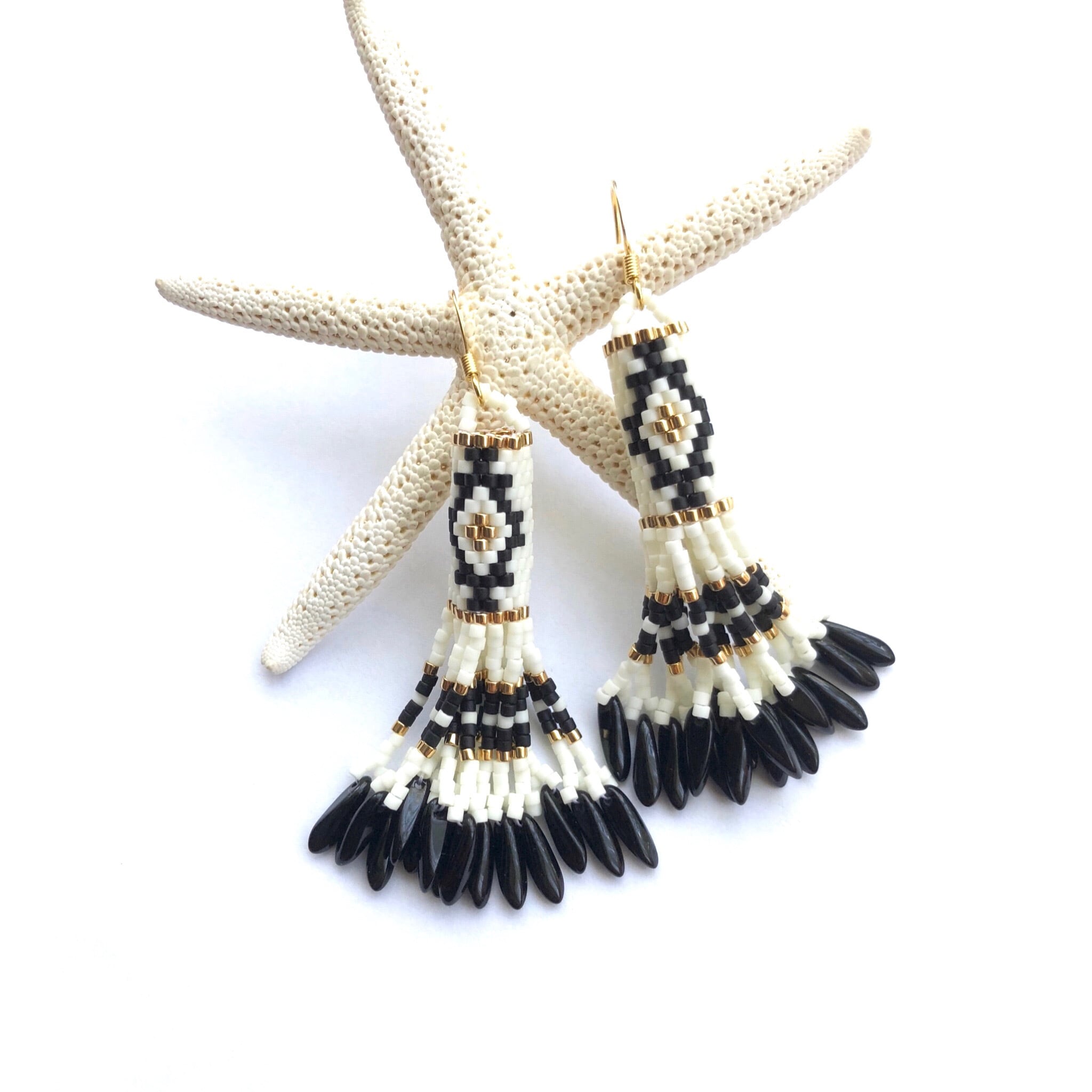フリンジ部分には、チェコビーズを使用しておりシャープな印象をプラス。