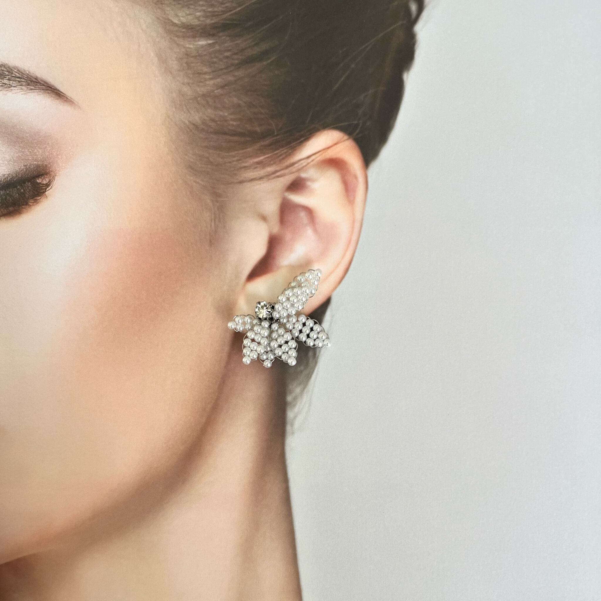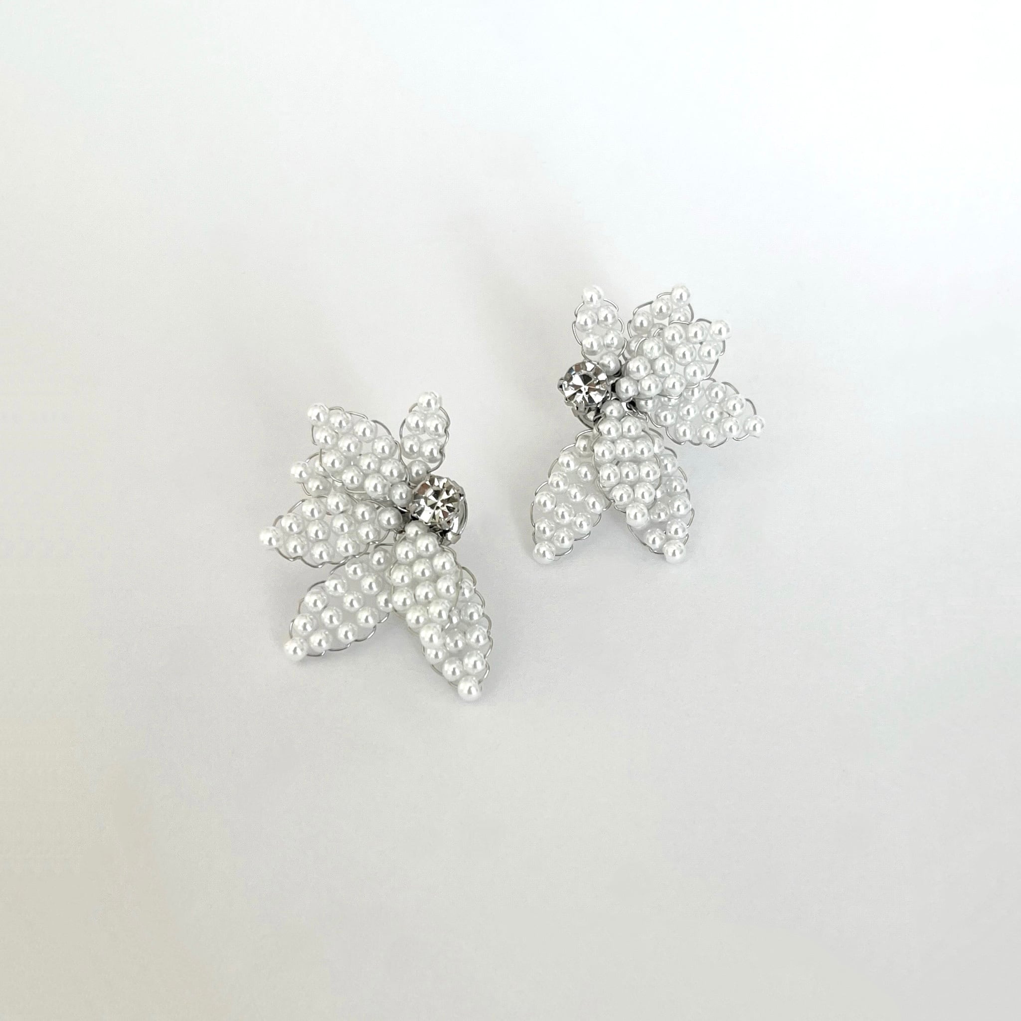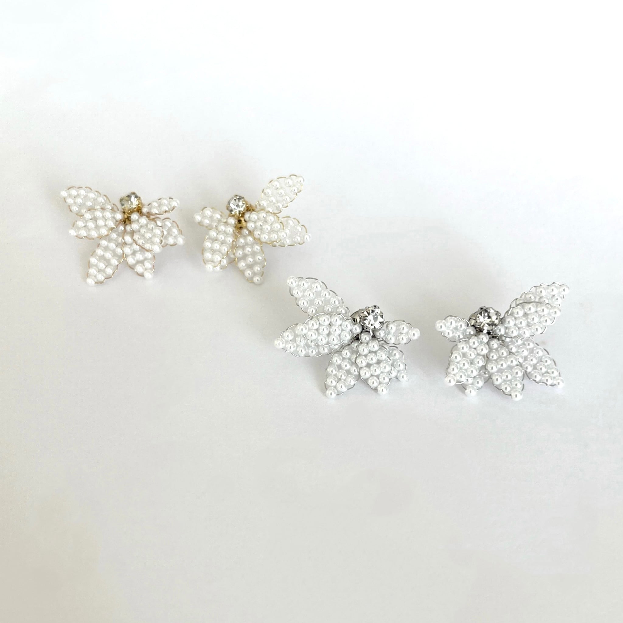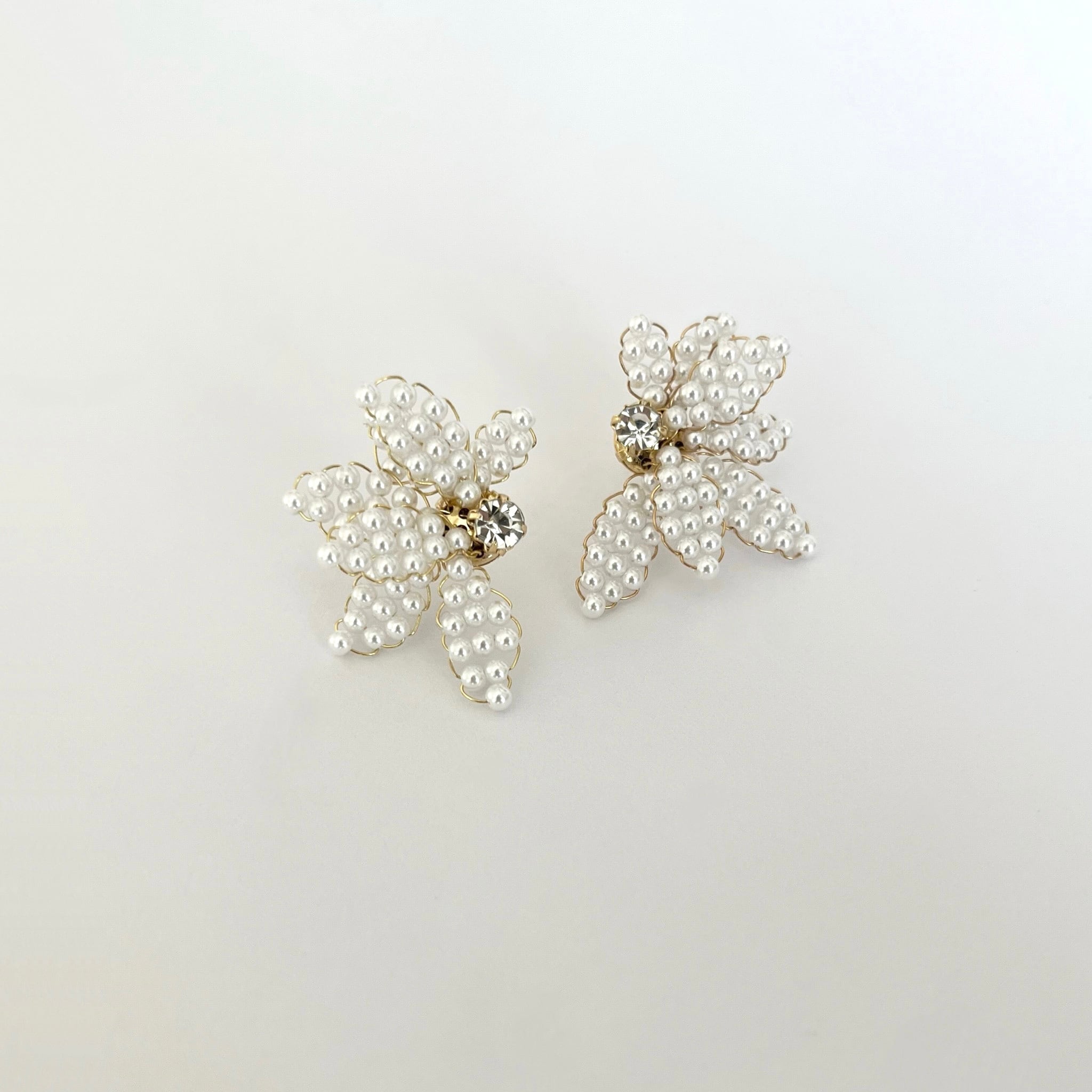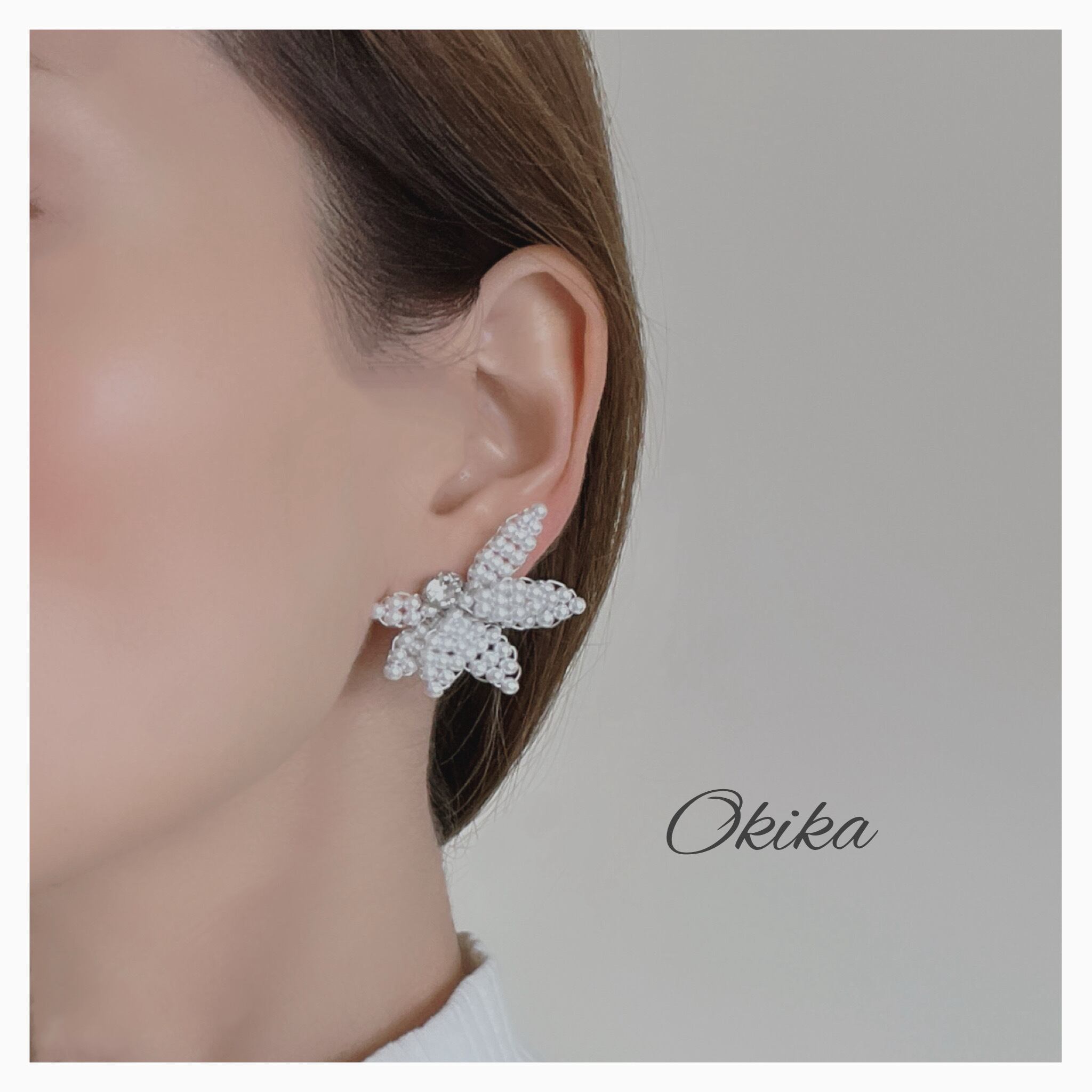 繊細なビーズを花びらのように編み上げた、ハーフフラワーモチーフのピアス/イヤリング 。