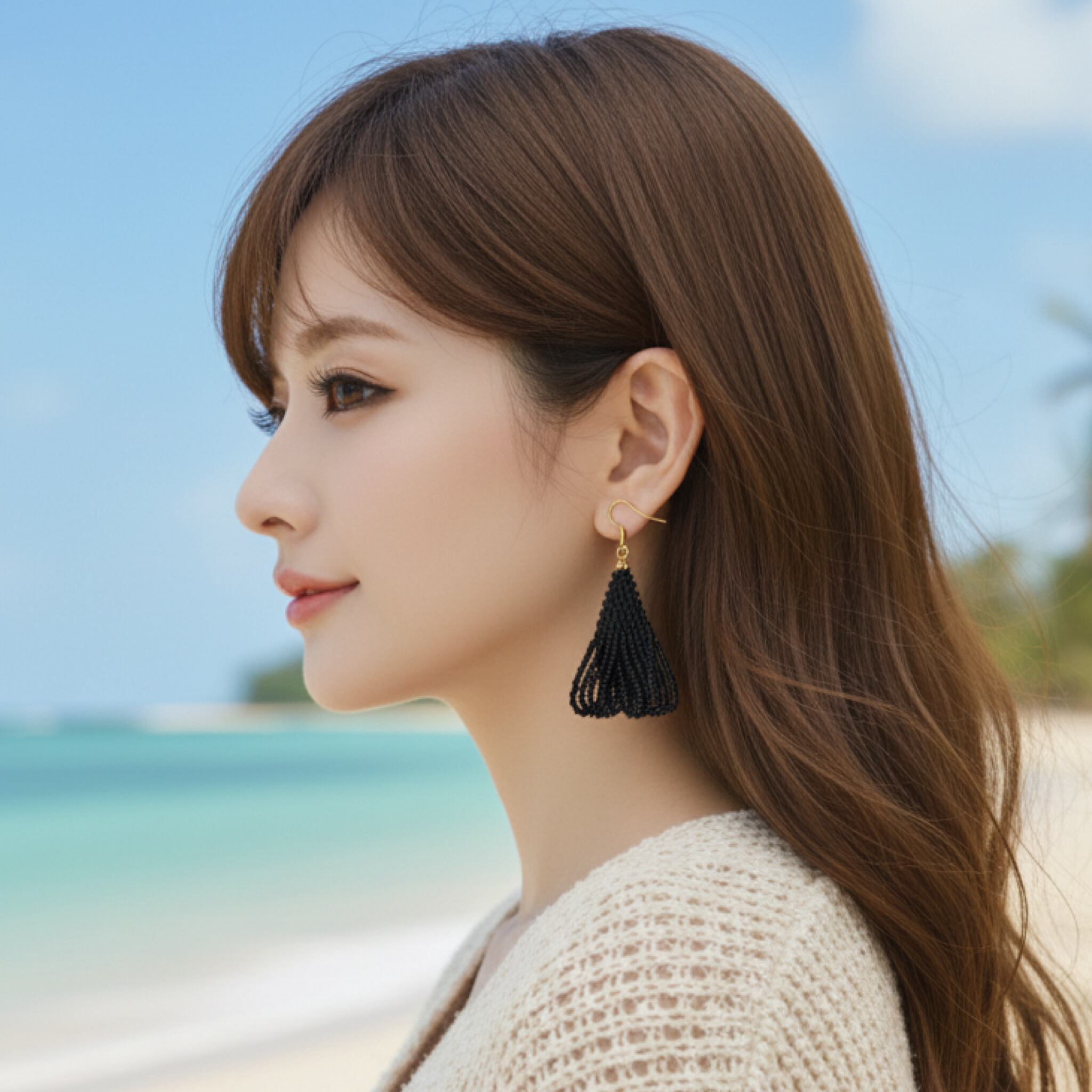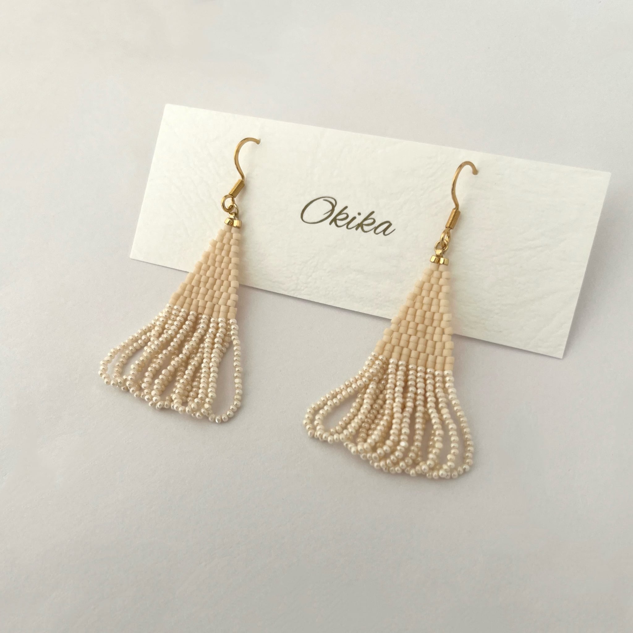 繊細に編み込まれたビーズと、動きに合わせて揺れるフリンジが
