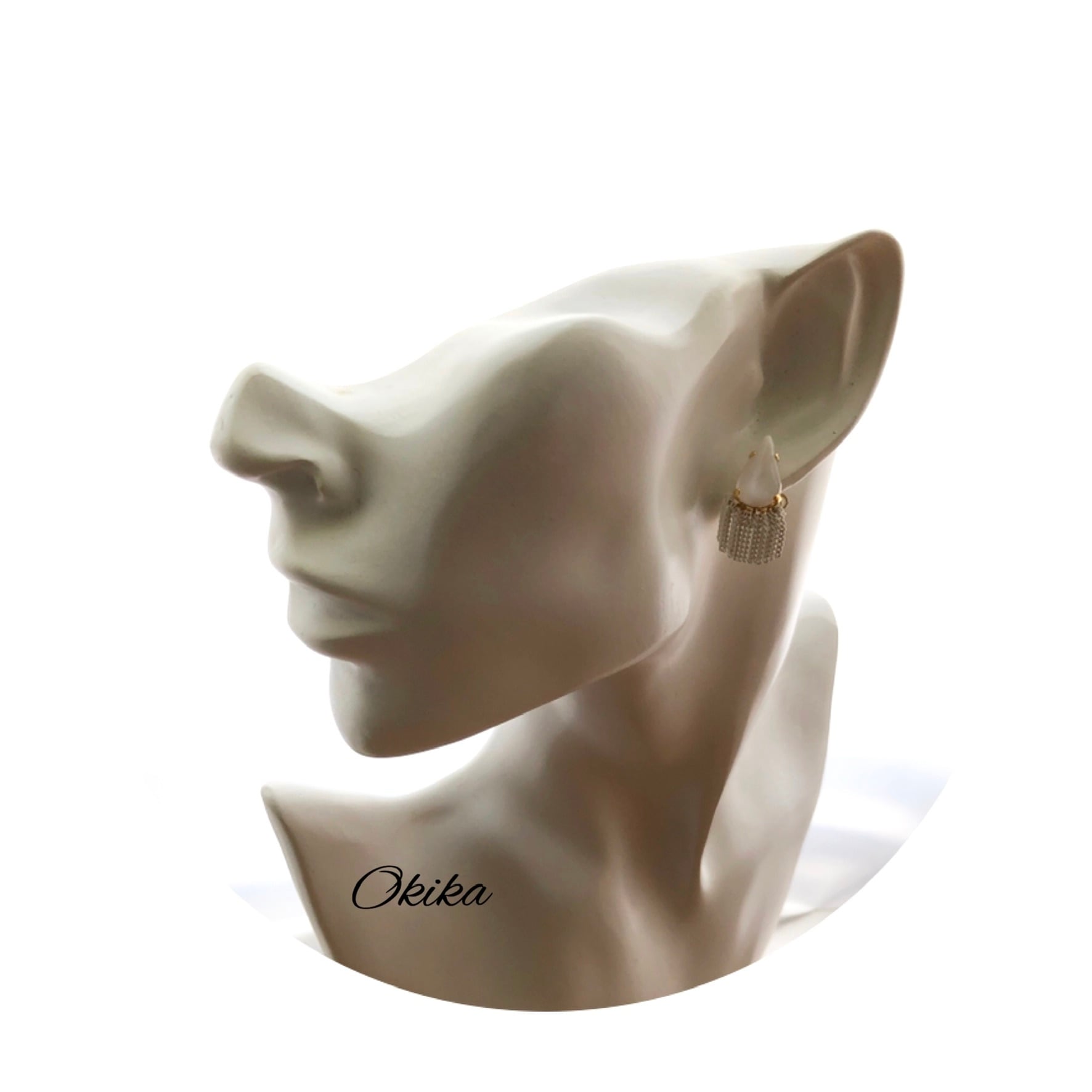 ヴィンテージグラスストーン×チェーン ピアス【White×white】