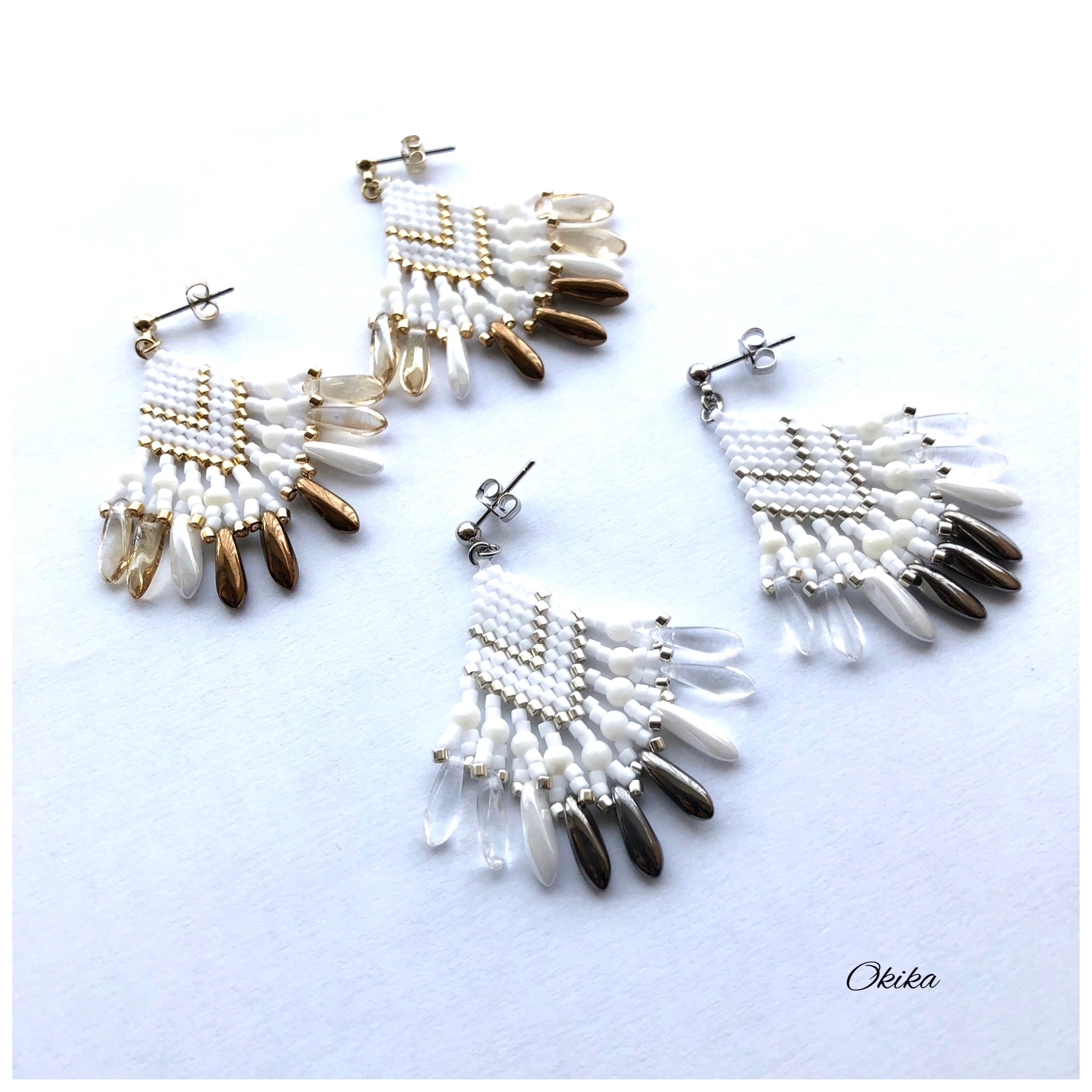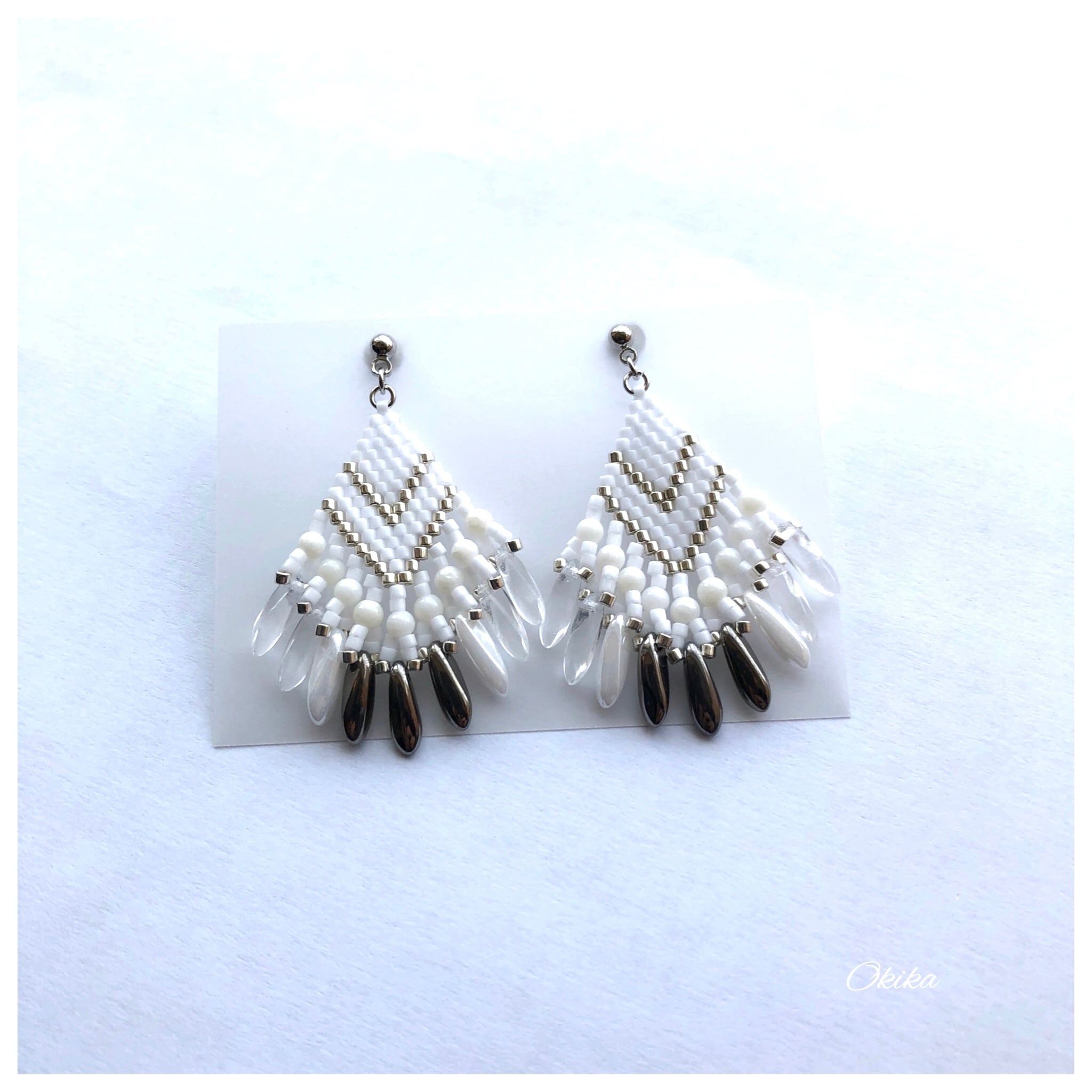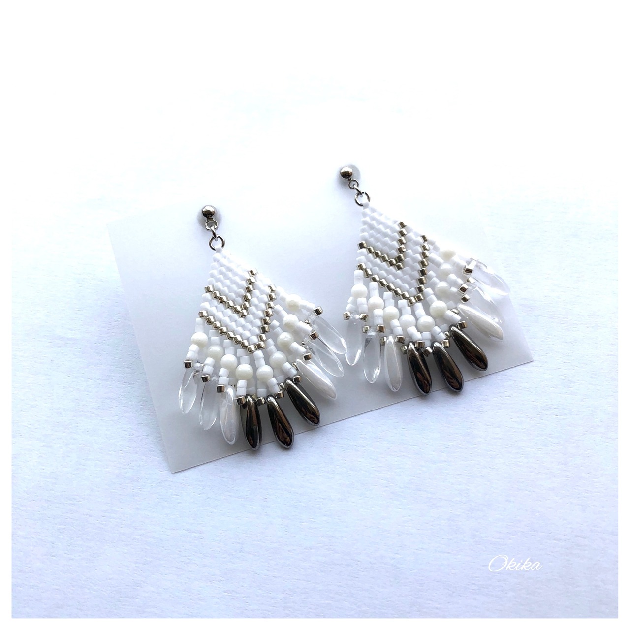 チェコビーズ フリンジ ピアス/イヤリング【White×silver】
