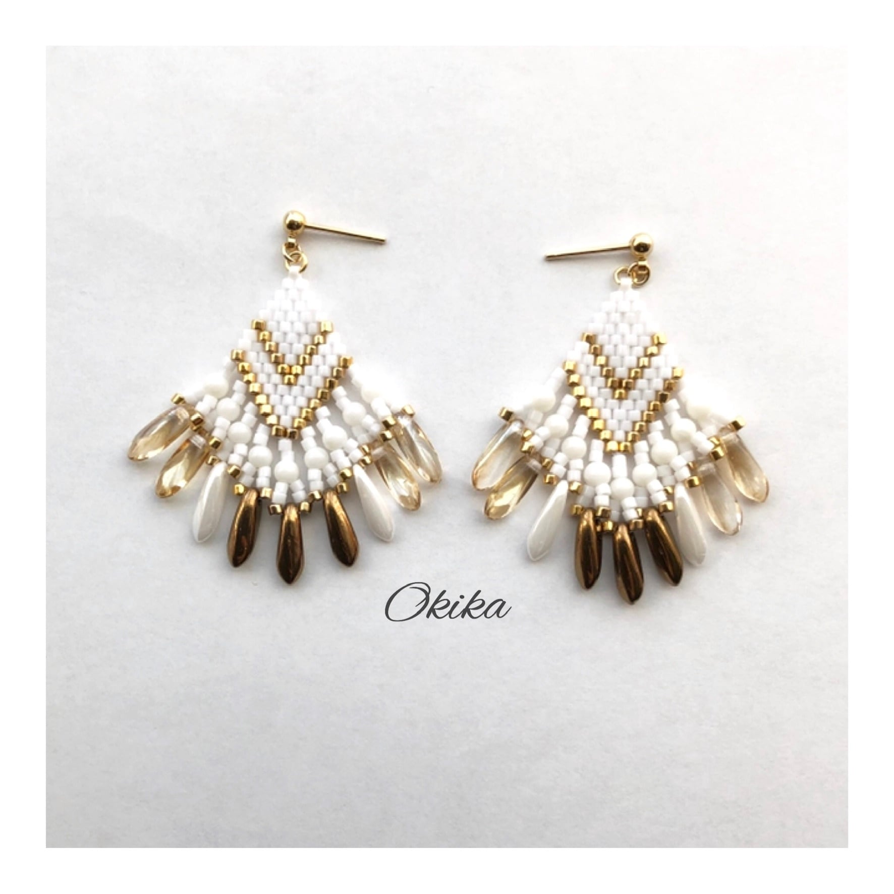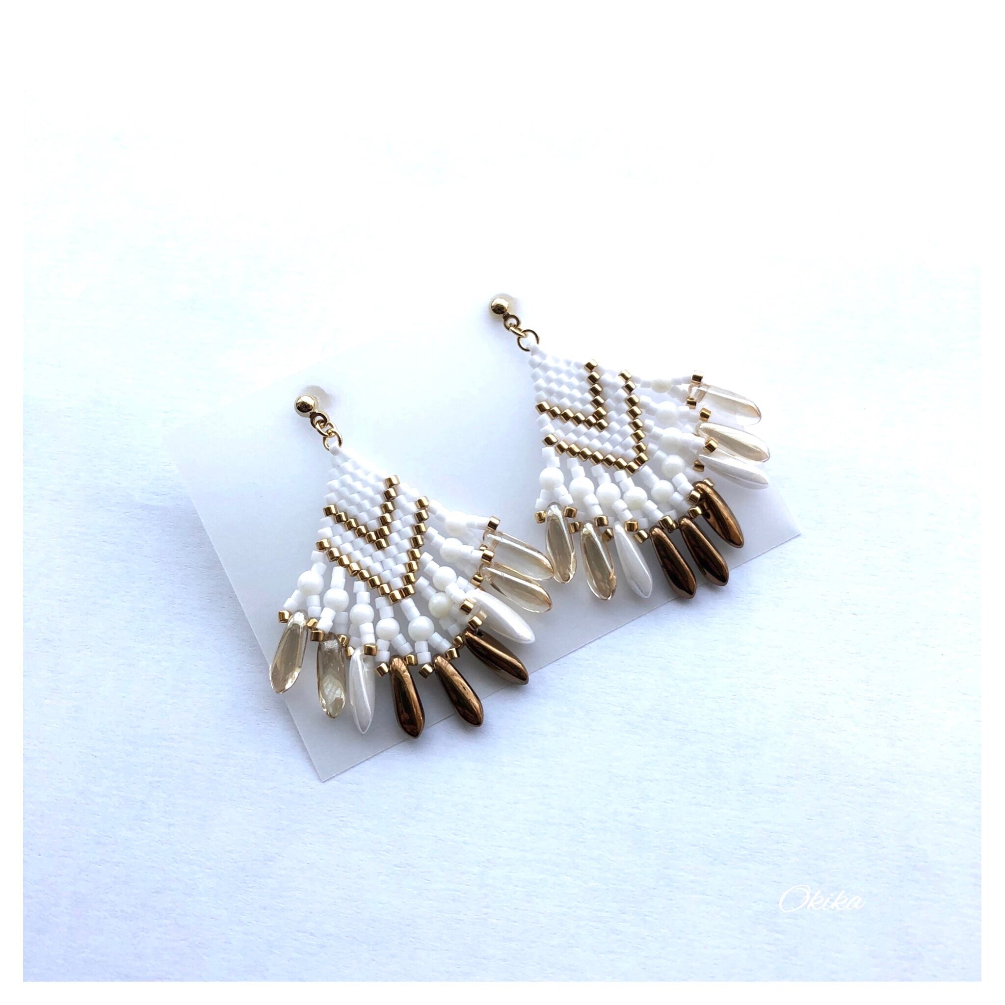 チェコビーズ フリンジ ピアス/イヤリング【White×gold】