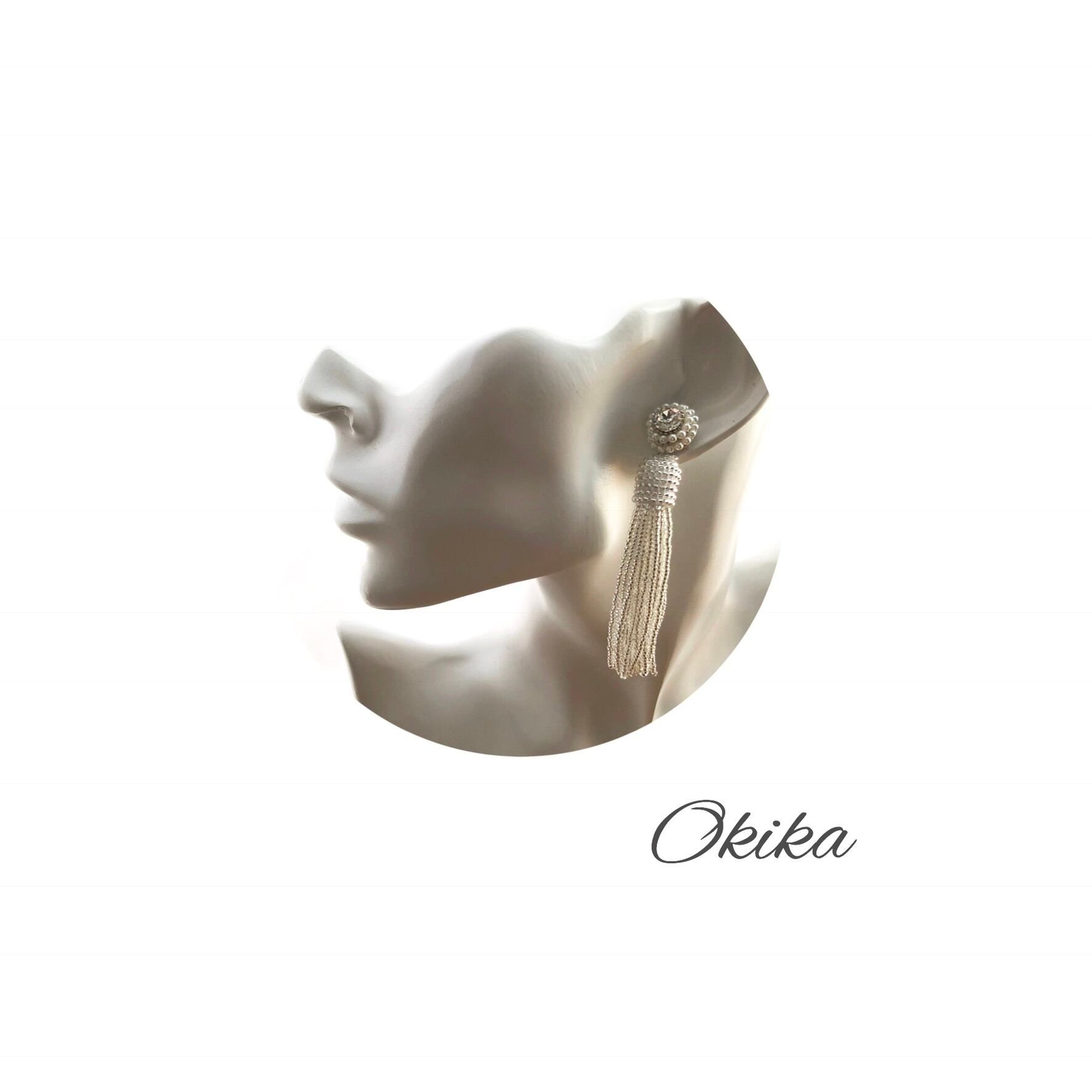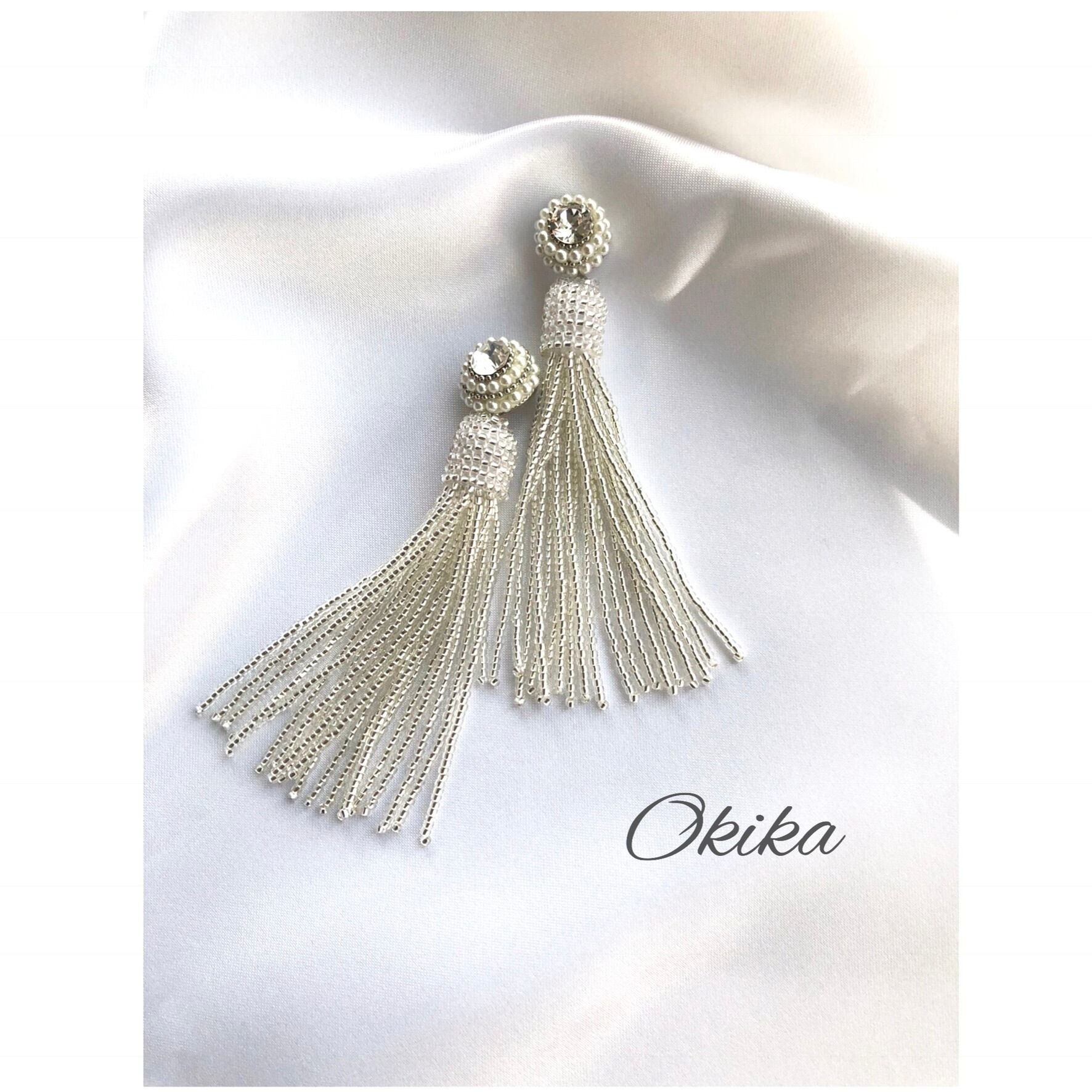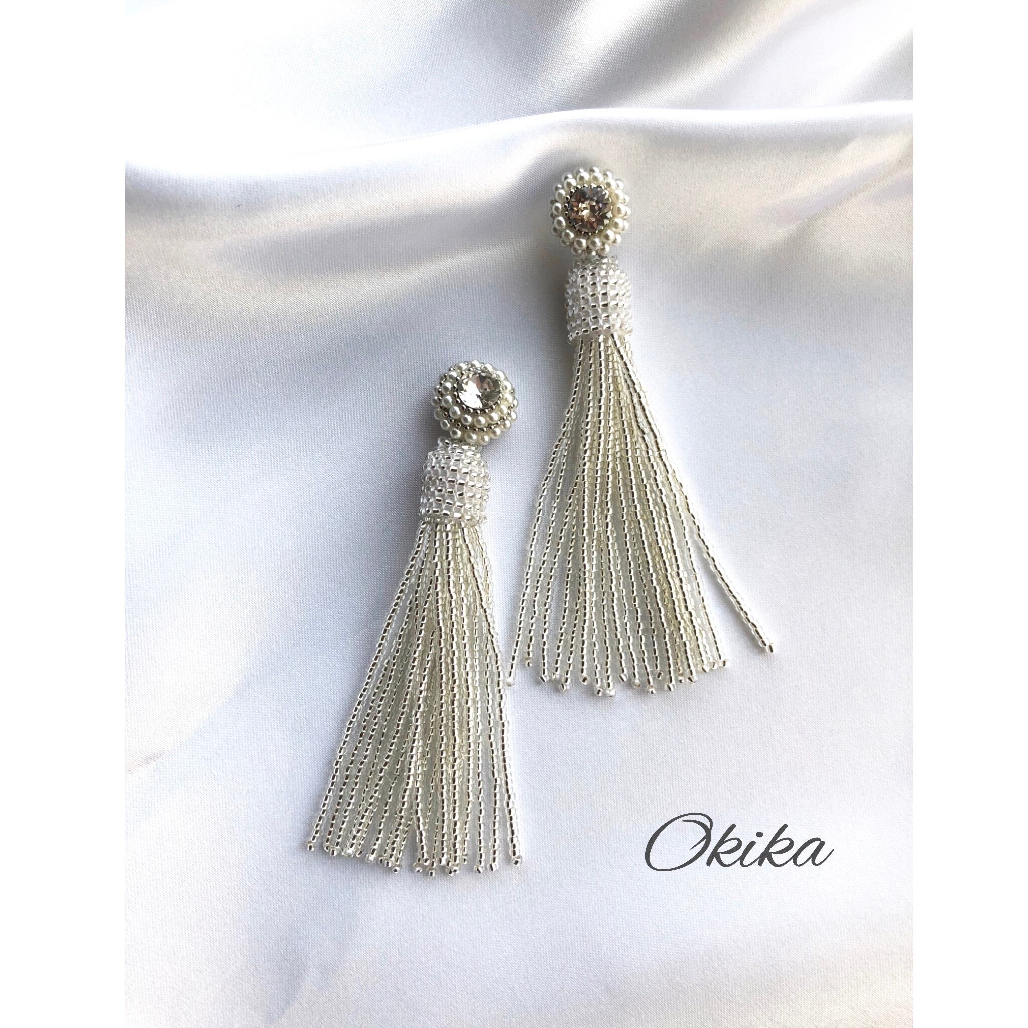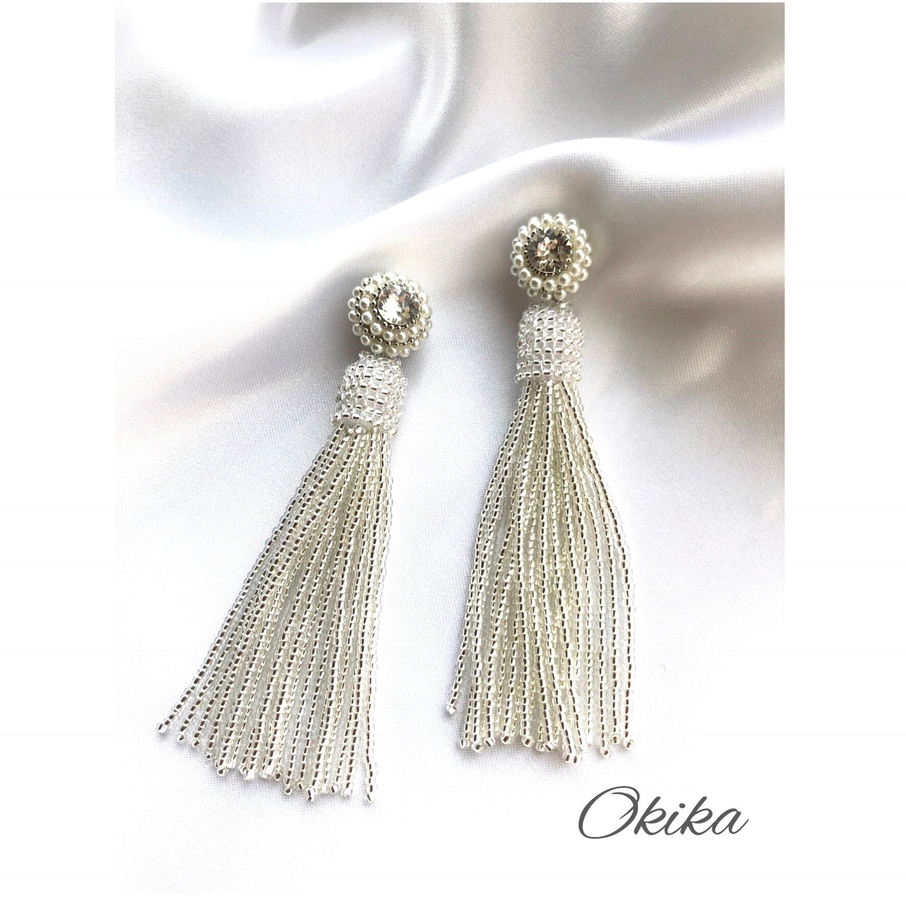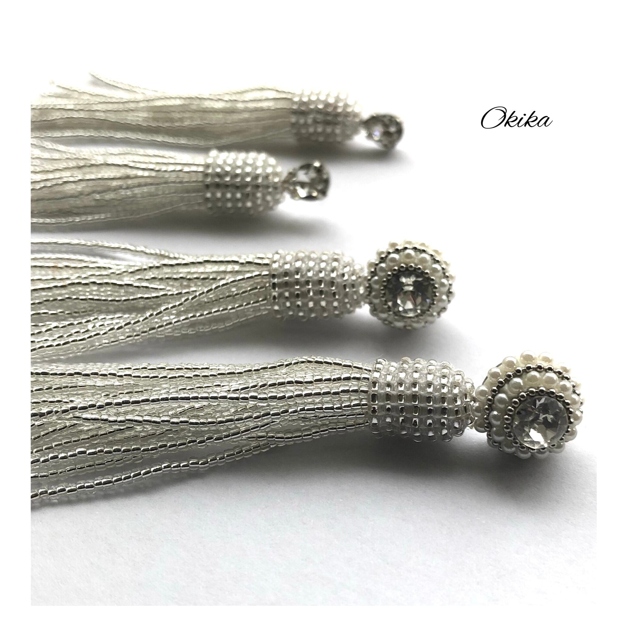 スワロフスキー×パール×極小のビーズフリンジタッセルを組み合わせ、上品さと華やかさを併せ持つデザインにいたしました。