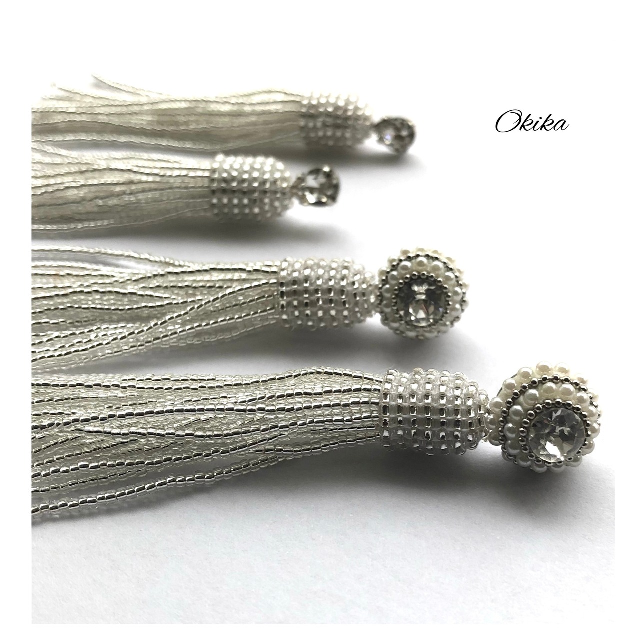 タッセルの上部は一粒一粒手作業でビーズを編み込んでおります。微妙な力加減が必要でとても時間のかかる技法ですが、どの角度から見てもビーズが均一に揃うようにしています。